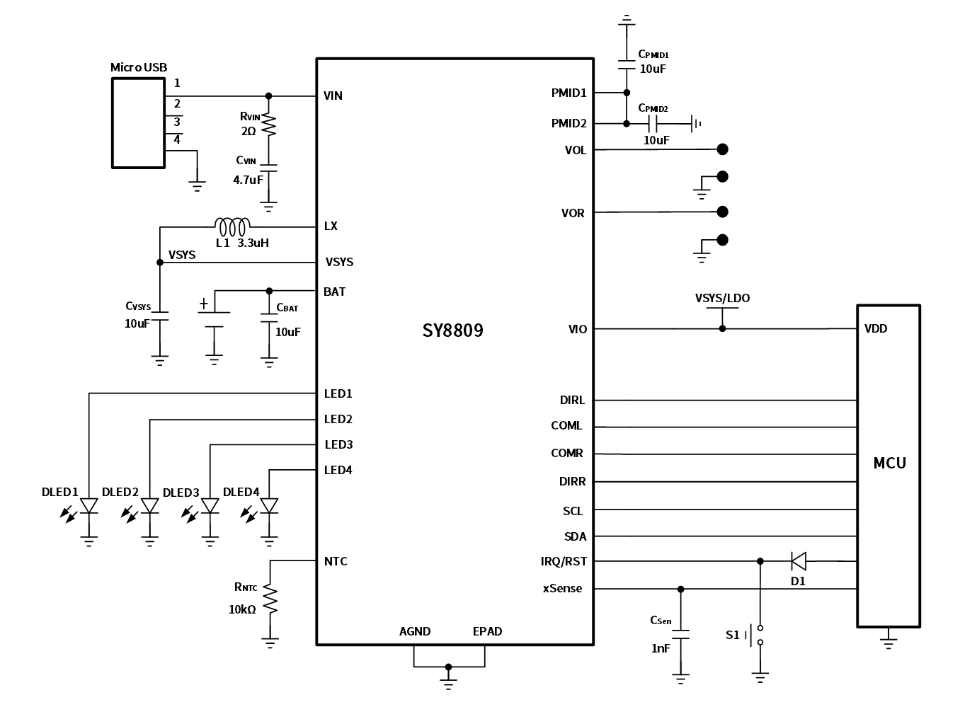 SY8809 integrates standard I2C interface and interrupt for communication with MCU, and control charging and discharging functions.