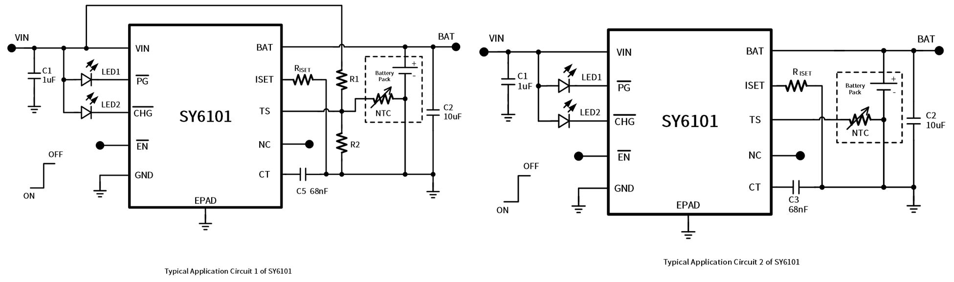 SY6101 can turn off the power transistor after the BAT has been fully charged. When the charging current is lower than 10% of the ICC, the charging is turned off and then turned on after the BAT is lower than recharging threshold. SY6101 has pin PG and CHG, which can drive a LED, or combine with EN to process signal interaction with MCU. When power on, the PG is turned on. CHG is used for indicating that the charge has been completed.