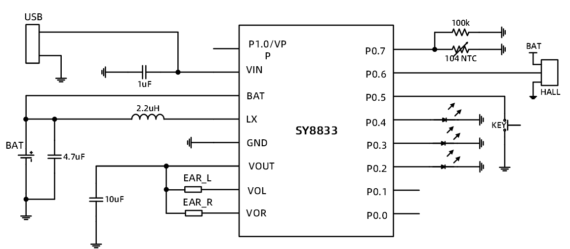 SY8833是專門為TWS耳機充電倉設計的全集成SoC芯片。SY8833內(nèi)部集成了兼容8051指令集的CPU,256字節(jié)RAM, 4k字節(jié)OTP程序存儲區(qū),多通道10位ADC,9個GPIO,一個線性充電模塊,一個Boost升壓模塊和兩個獨立放電控制MOS管。SY8833為SOP16封裝。