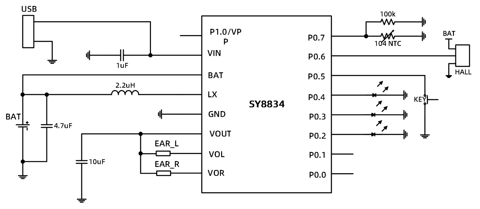 SY8834是專門為TWS耳機(jī)充電倉設(shè)計的全集成SoC芯片。SY8834內(nèi)部集成了兼容8051指令集的CPU,256字節(jié)RAM, 4k字節(jié)OTP程序存儲區(qū),多通道10位ADC,9個GPIO,一個線性充電模塊,一個Boost升壓模塊和兩個獨(dú)立放電控制MOS管。SY8834芯片VIN管腳支持過壓保護(hù),最高耐壓可達(dá)35V。