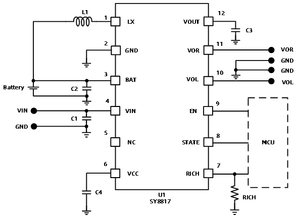 SY8817具備充放電使能控制,MCU既可以通過RICH引腳控制芯片的充電功能,又可以通過EN引腳來控制芯片的放電功能,同時芯片還集成了單線的狀態(tài)碼輸出,可以向MCU上報芯片的充放電狀態(tài)。