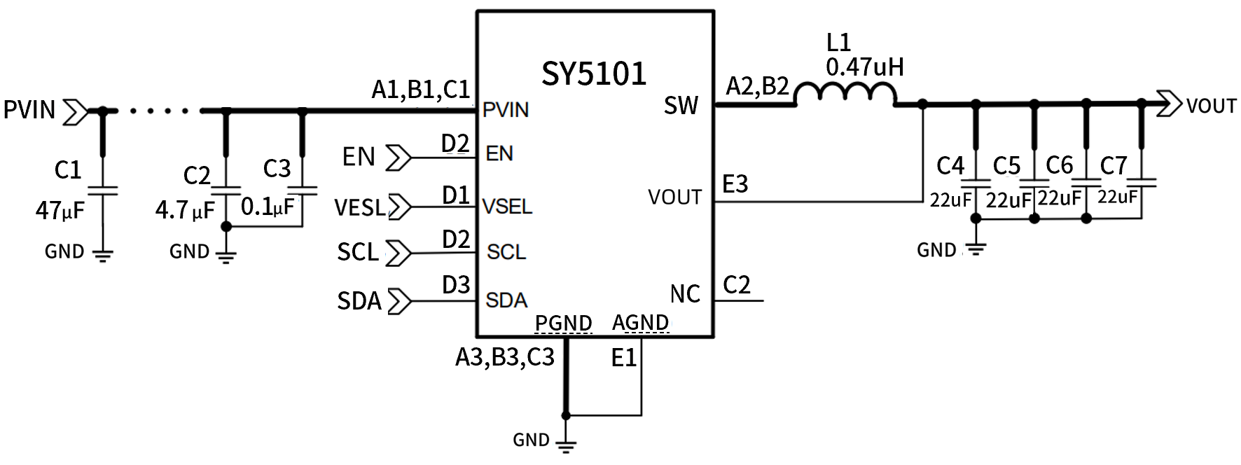 SY5101支持3A的輸出電流,且保持高達(dá)80%效率工作,在低電流時(shí)(<10mA),也能保證80%的轉(zhuǎn)化效率。SY5101在PWM模式下定頻工作在2.4MHz,較高的工作頻率可以使用較低感值電感,以滿足輸出電壓紋波與環(huán)路穩(wěn)定的要求,推介使用0.33uH或者0.47uH的電感。